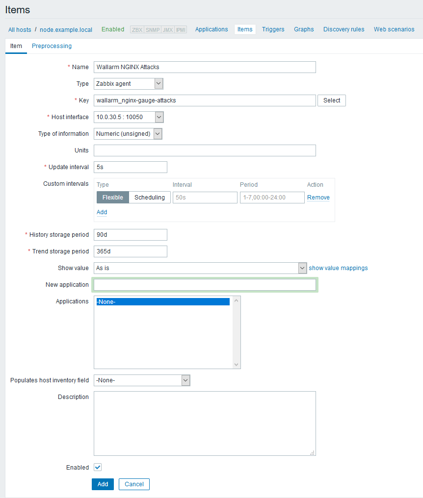 UserParameter=in the Zabbix agent configuration; for example,wallarm_nginx-gauge-abnormal). - If necessary, adjust the update frequency of the metric value and other parameters.