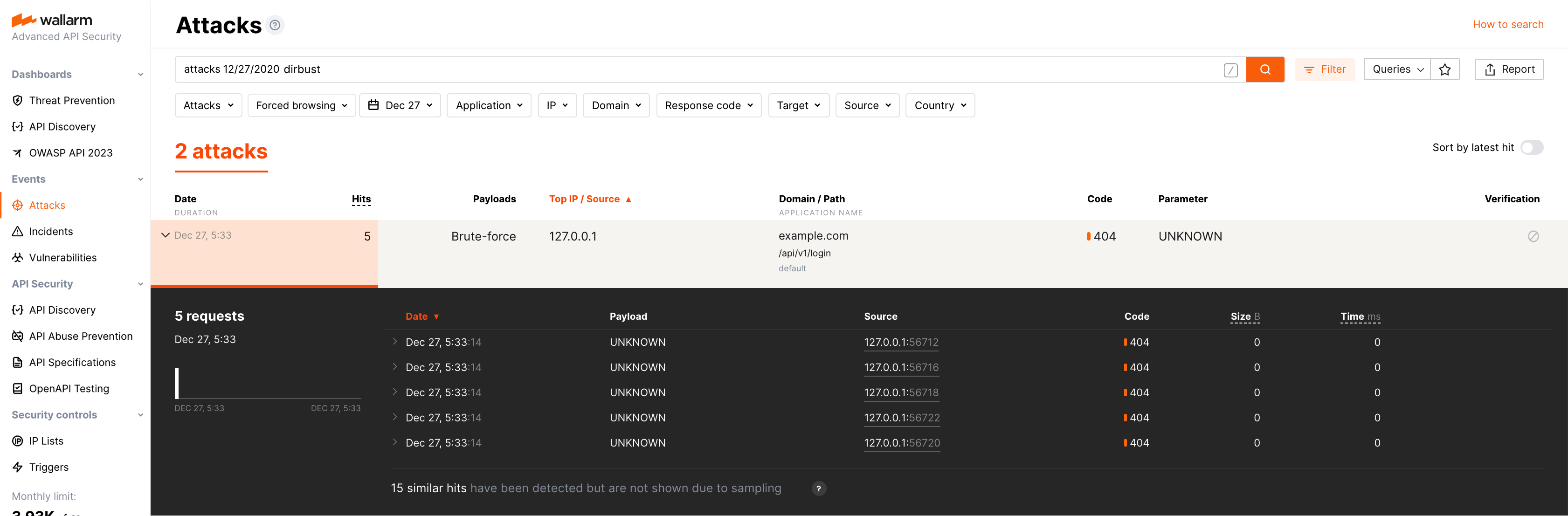 Open the section Attacks and check that requests are displayed in the list as a forced browsing attack.