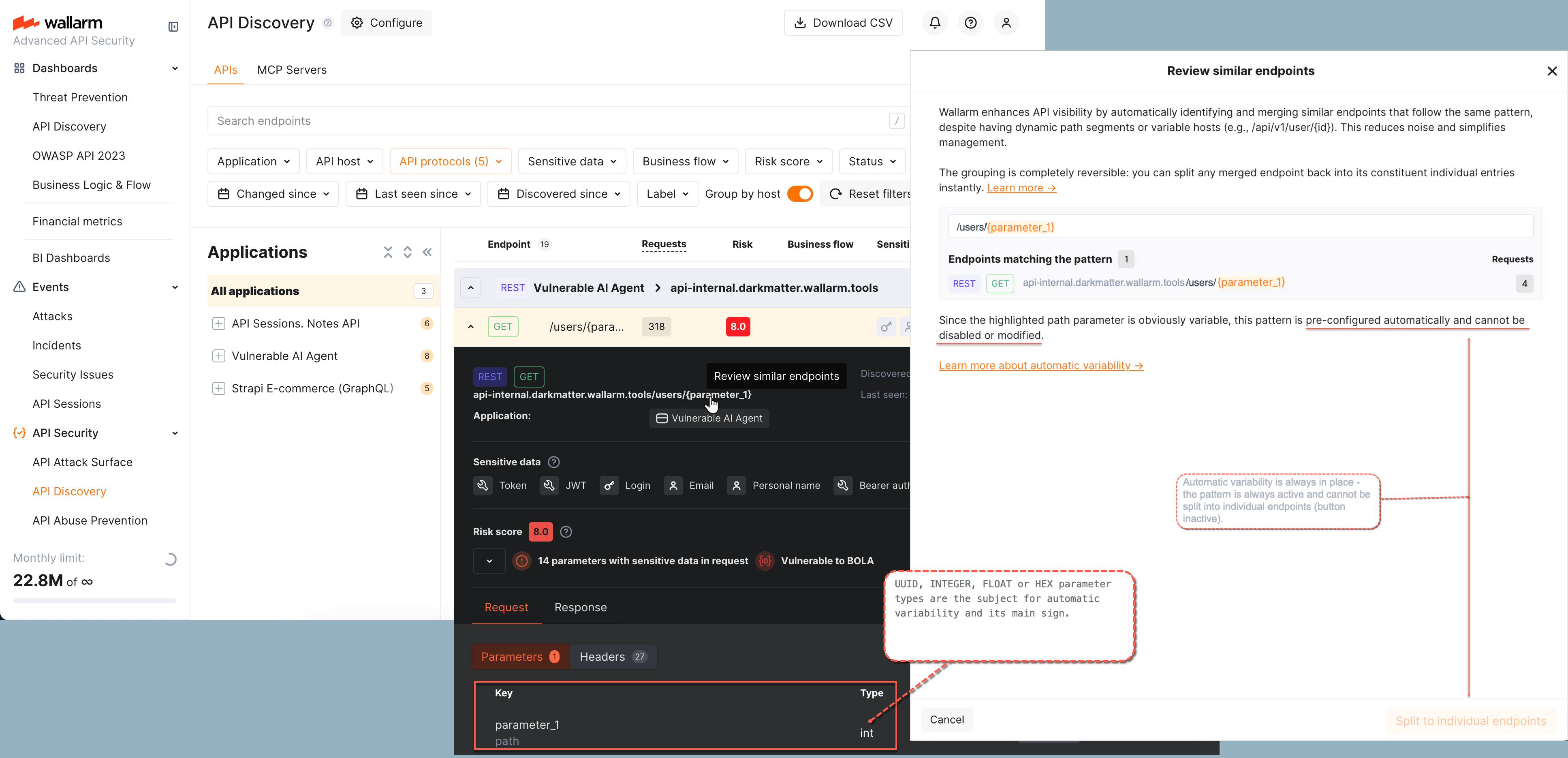 These varying segments are diverse elements in URLs, such as user IDs. API Discovery automatically detects them for UUID, INTEGER, FLOAT and HEX path segment types. In some specific cases, automatic variability can work on a wider scope of parameter types.