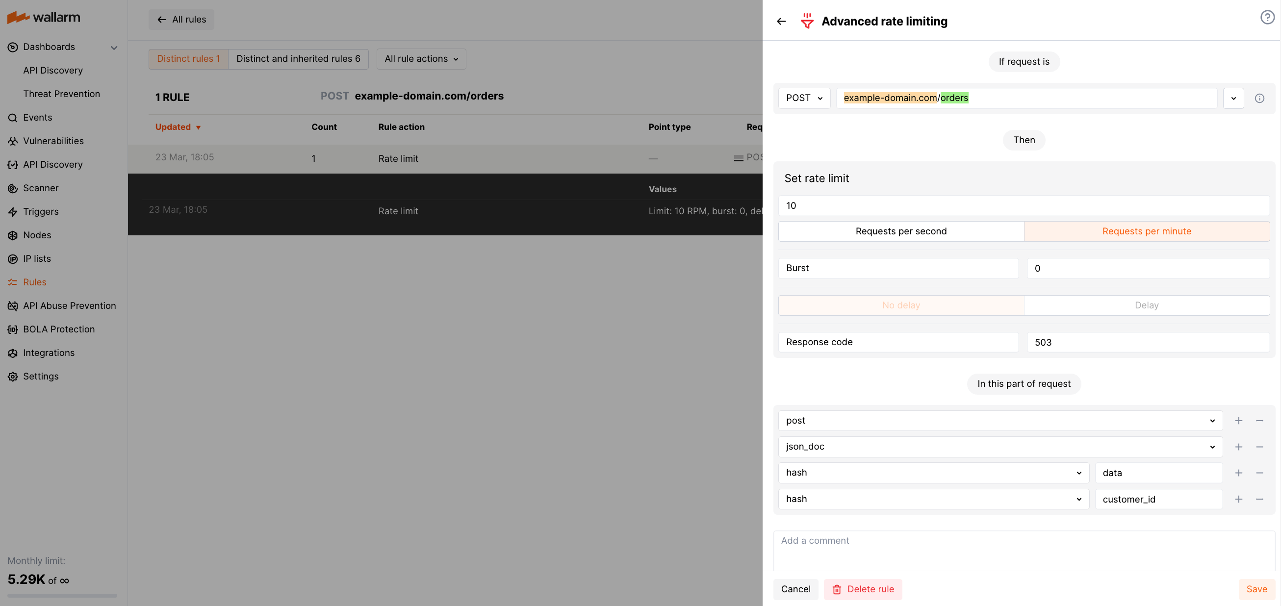 For example, the rule limiting each customer by 10 POST requests per minute to https://example-domain.com/orders may look as below. This example considers a customer ID is passed in the data.customer_id JSON body object.
